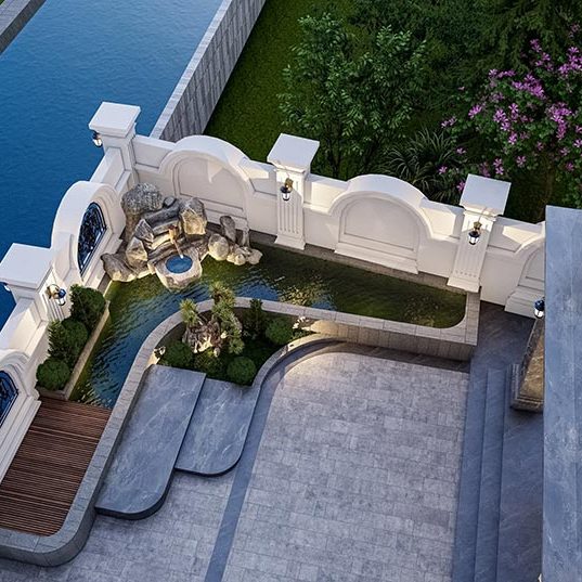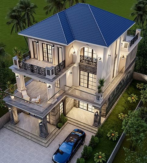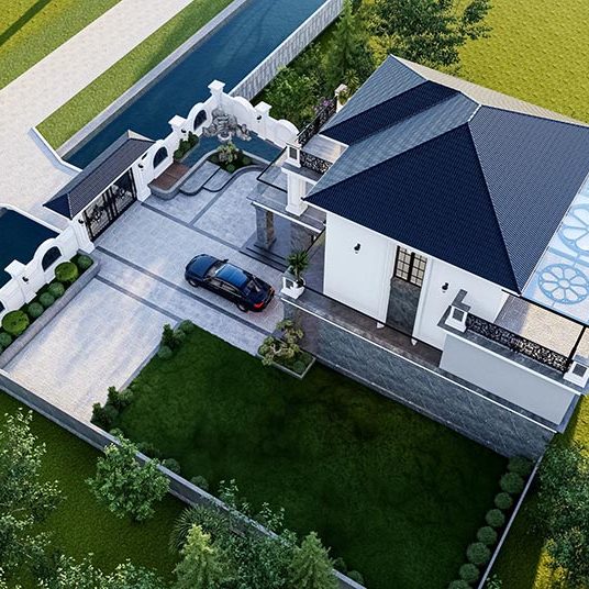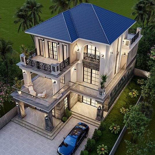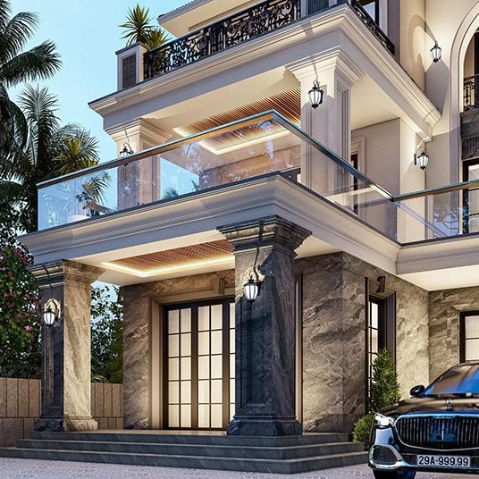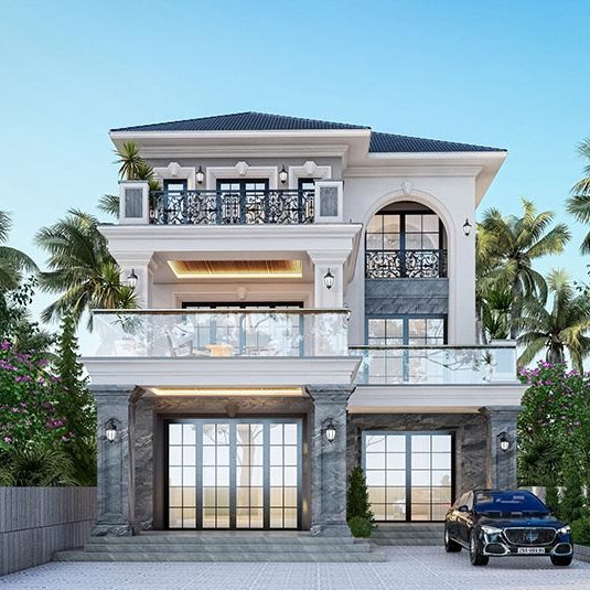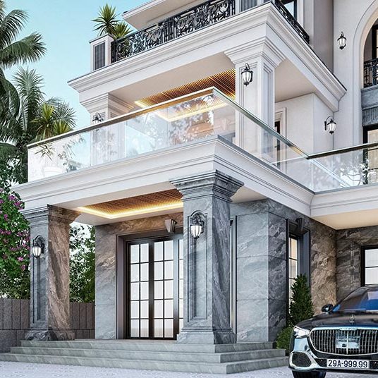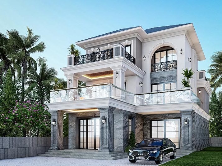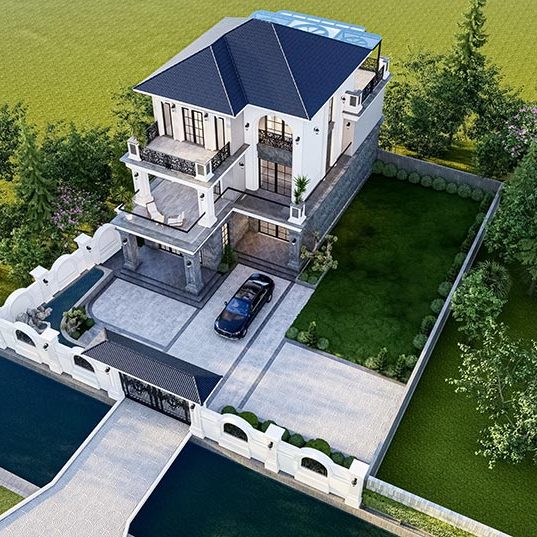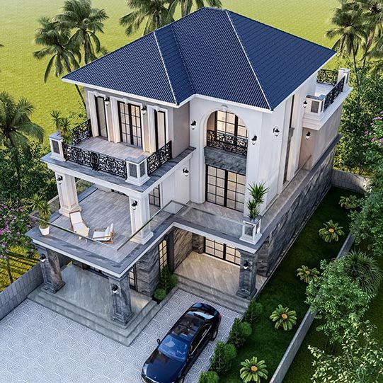 Chủ nhà mong muốn một không gian sống sang trọng, tiện nghi và hòa hợp với thiên nhiên. Biệt thự được thiết kế theo phong cách tân cổ điển với mái Thái, ban công rộng và đường nét kiến trúc tinh tế. Không gian thoáng đãng được thể hiện qua sân vườn rộng, nhiều cây xanh và lối đi thoáng mát. Cổng và hàng rào chắc chắn giúp tăng tính thẩm mỹ và đảm bảo an ninh. Sân trước rộng rãi thuận tiện để xe, trong khi hệ thống cửa kính lớn tận dụng ánh sáng tự nhiên, kết nối hài hòa giữa nội thất và ngoại cảnh. Ngôi nhà không chỉ đáp ứng nhu cầu tiện nghi mà còn thể hiện phong cách sống đẳng cấp, bền vững.
